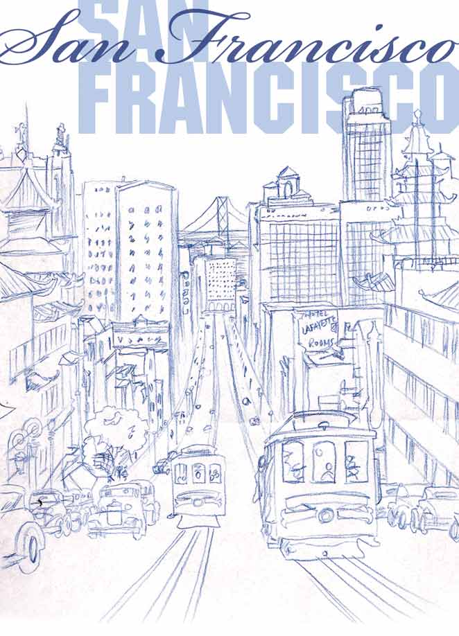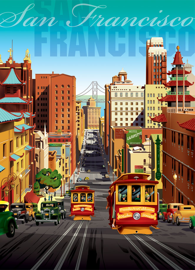 A digital Illustration showing classic San Fransisco inspired by vintage poster design.