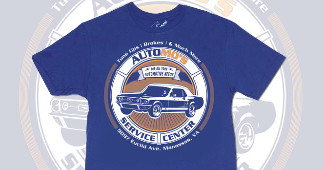 The 67' Mustang GT is the mascot for this Auto Service Center. There was a need for a retro design to represent the shop and be given to employees to wear as an alternative to their regular mechanic's uniforms.