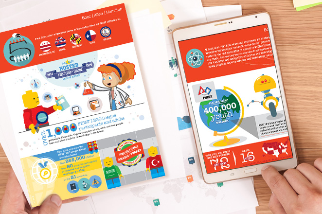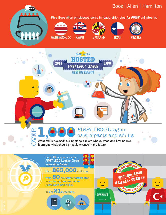 Highlighting accomplishments with First and First Lego League with the use of a 2 page infographic to help explain the overall figures of competitors and employees who are all involved.